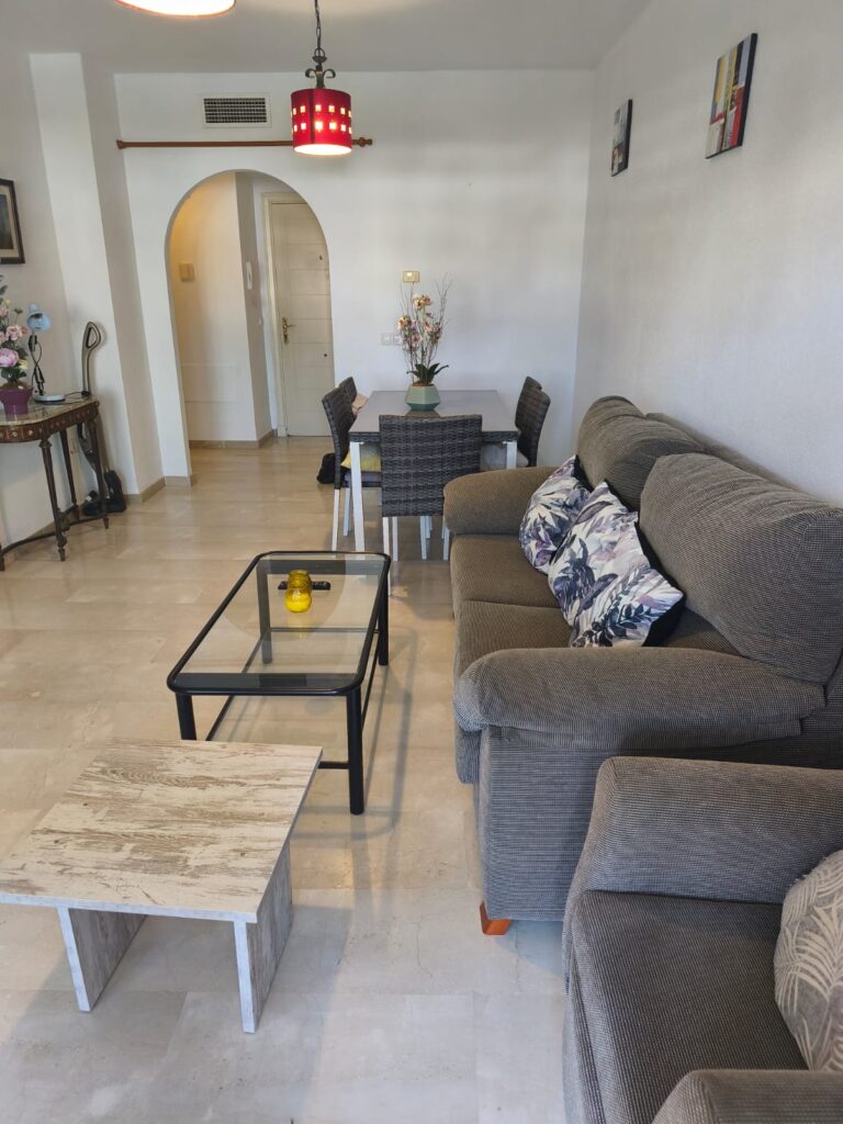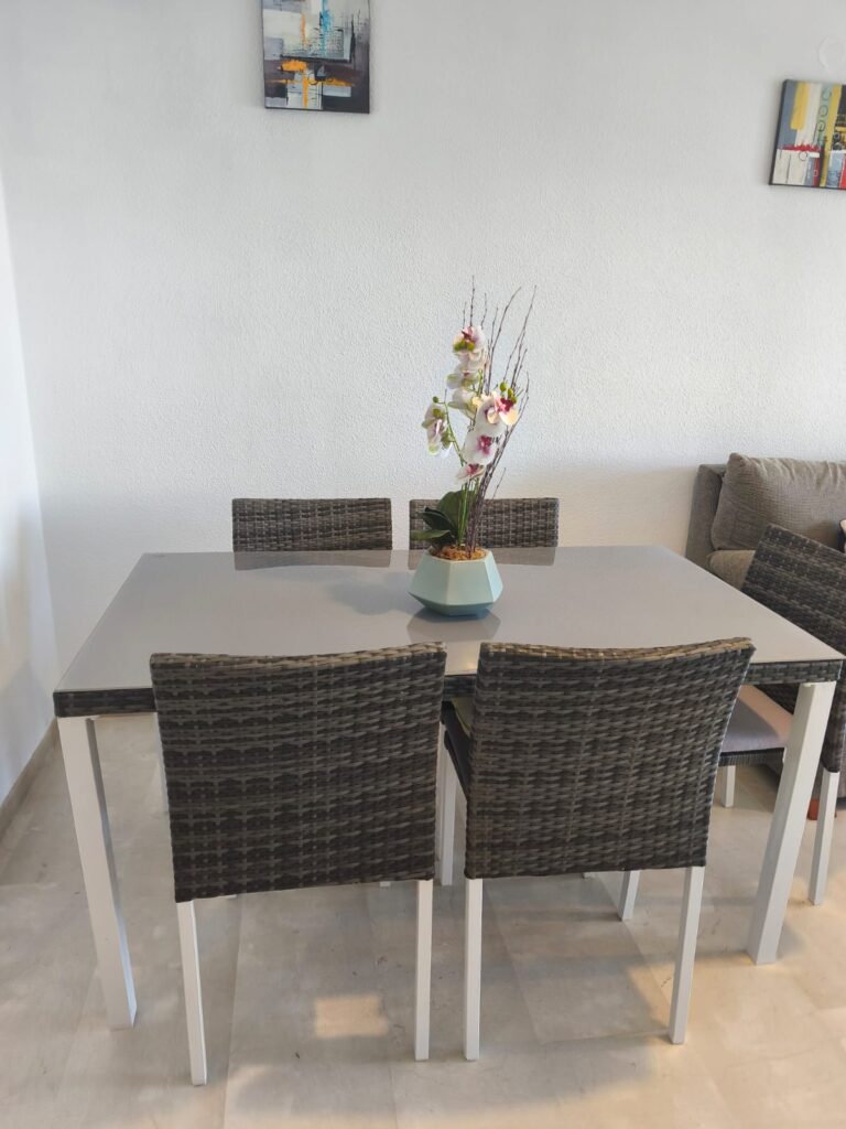 We present this cosy flat, perfect for enjoying a comfortable and practical stay. The property has 2 bedrooms (one with a double bed and the other with two single beds), 1 bathroom, a kitchen with a utility room, and a spacious and bright living room with access to the terrace, from which you can enjoy views of the swimming pool and the community gardens.